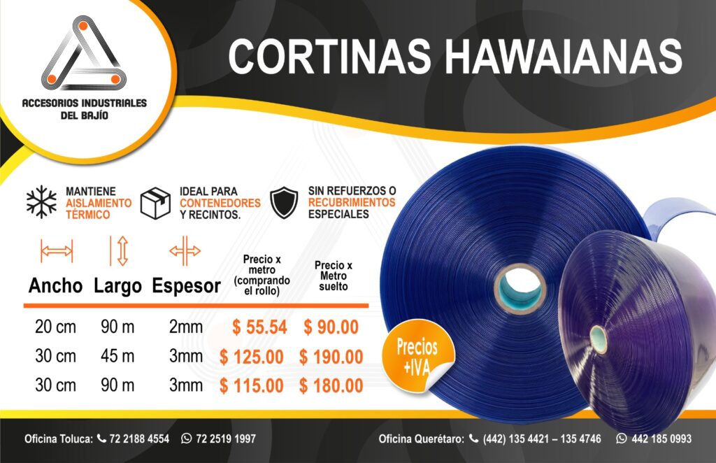 Rollo de película de PVC gruesa para usarse como cortina Hawaiana en entradas de bodegas, refrigeradores, etc., donde se requiera que se aísle parcialmente de polvo y ruido. Precios + IVA